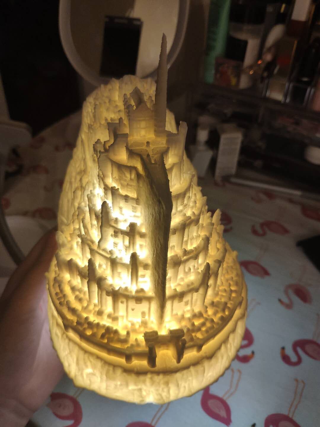 The Minas Tirith model is separated into two parts. The top part is a hollow castle, and the bottle part is a light stand. Together, the maker can insert the LED light bulb inside and make the 3D printed Minas Tirith become a table lamp!